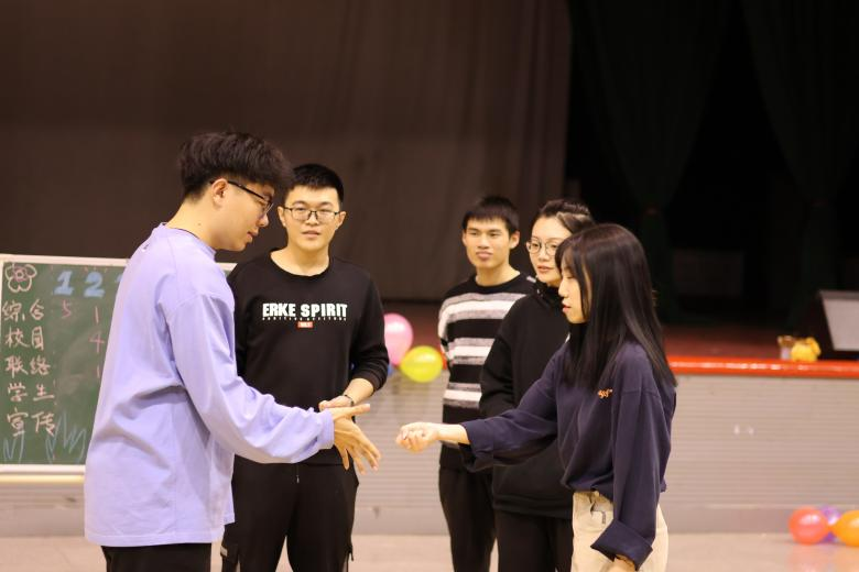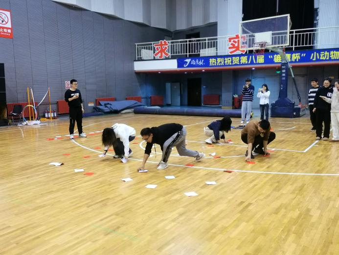 第四个游戏是青蛙剪刀石头布。每支队伍所有人轮流与工作人员进行剪刀石头布,挑战者赢了要喊“输了”,输了要喊“赢了”,平局要喊“呱呱”,说错者被淘汰。这个游戏考验的就是同学们的临场反应能力,现场欢声一片。