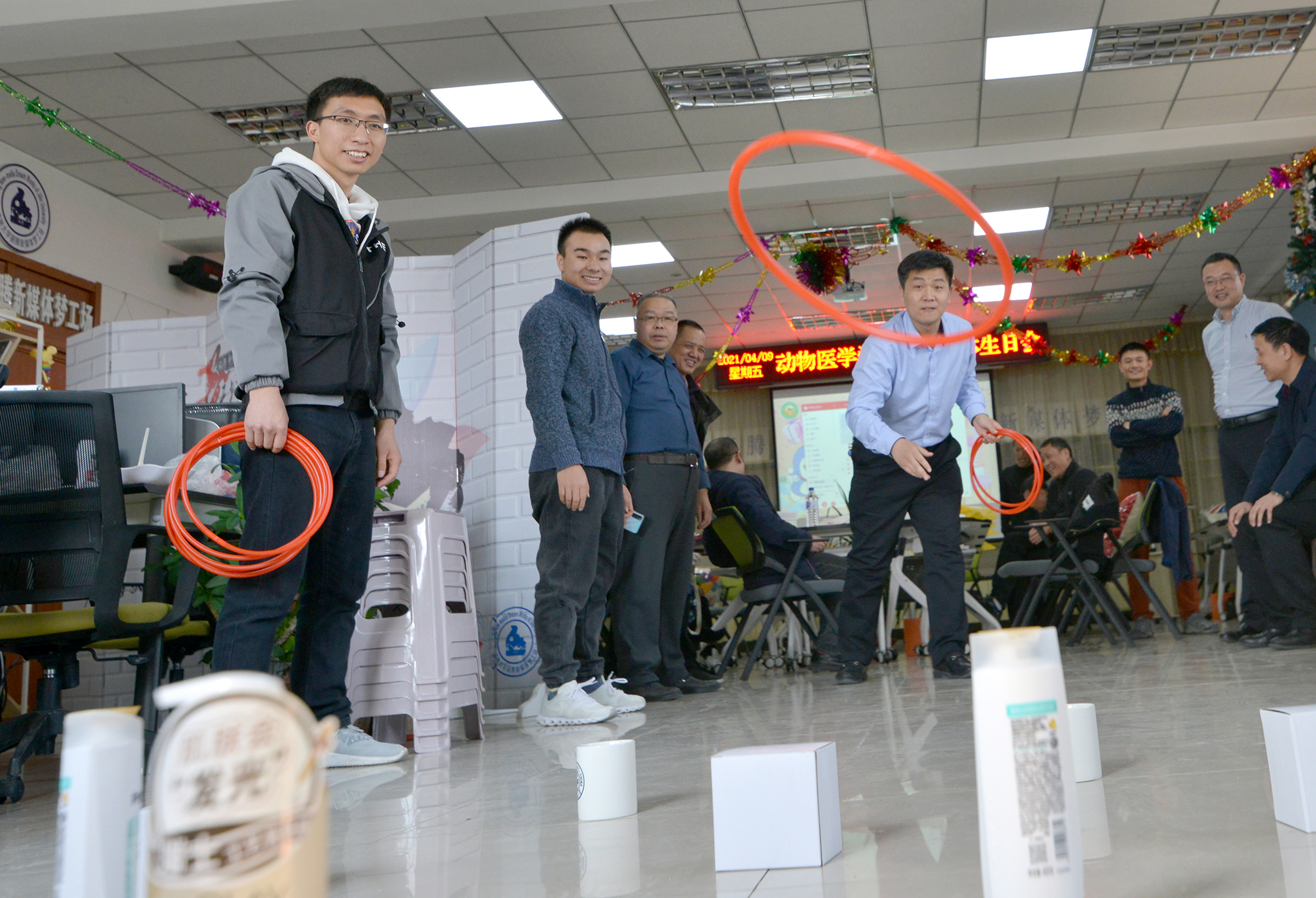 随后,游戏部分节目开始,老师们踊跃参与“击鼓传花”、“抢凳子”、“套圈”等游戏项目,频繁互动,现场充满了欢乐的气氛和久违了的开心幸福;最后,生日会在全体老师合唱《团结就是力量》中圆满结束。